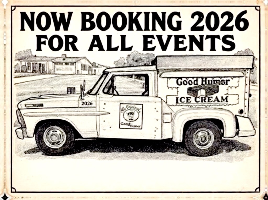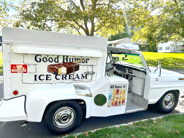 Yes, it’s an original 1969, Ford 250 truck, comes with Good Humor Ice Cream bars (on a stick) complete with a living, breathing Good Humor Ice Cream Man who drives the Truck. He comes dressed like he has stepped right out of the 1960s.